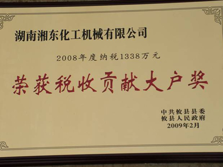 昨天,從攸縣三級干部會上獲悉,湖南湘東化工機械有限公司為攸縣實現“五年倍增,爭創一流”目標,做出了積極的貢獻,獲得稅收貢獻大戶獎、技改投入獎和科技創新獎。